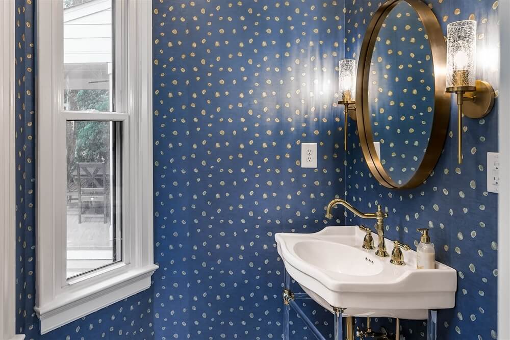To create room for a larger kitchen, the powder room was situated towards the back of the home near large windows to create the illusion of a larger space and allow for tons of natural light. The new powder room is adorned with navy and gold wallpaper. The gold is echoed throughout the room’s many brass details. The white sink is supported by unique acrylic legs that add tons of character to the space.