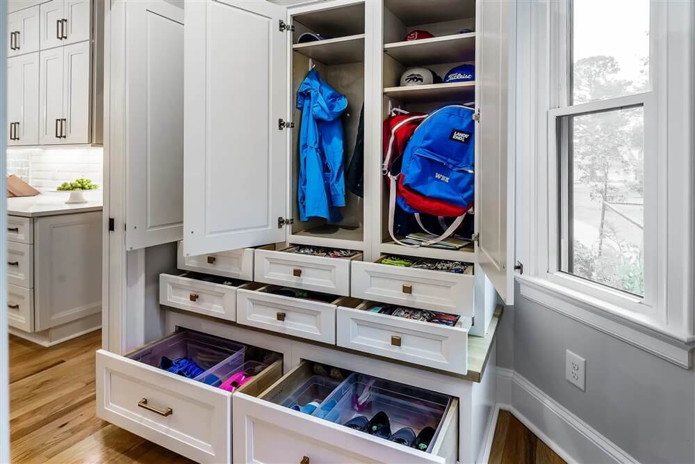 With young children, our family struggled with unnecessary clutter like backpacks, shoes, jackets, and more being left around the house. To combat this issue, we utilized the unused space in this kitchen, located near the front of the house, and created a “drop zone” perfect for storing and keeping the clutter at bay! Now our family can just grab what they need and head straight for the door.