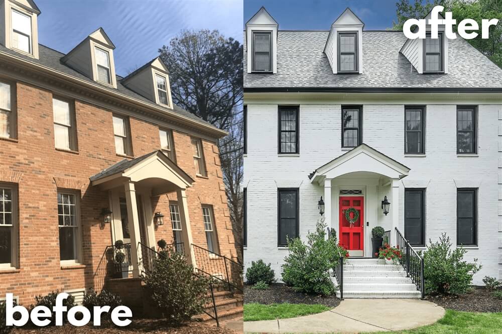 The exterior of the home previously was featuring brown brick, cream-colored accents, and your typical grey door. This was not their speed at all, they loved the modern look and we achieved that with a few color changes. The exterior is now white brick with a gorgeous red door for the perfect amount of curb appeal.