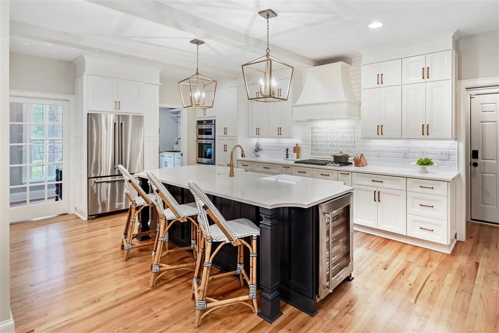 In the new kitchen, we chose classic white with navy accents. We added an adorable coffee bar and a dry bar with floating shelving and roll-out cabinet storage. Along the perimeter of the kitchen, we chose white cabinetry with white quartz countertops. This space is jam-packed with practical storage: tons of rollouts, a pantry area, a spice rack, etc.